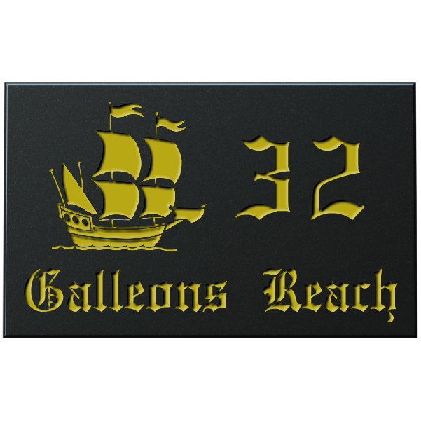 A very large rectangular granite plaque. This plaque is suitable for house names or corporate signs. The plaque can accomodate many lines of lettering. Available in a choice of 3 types of solid granite which are finished with  a polished face and edges. The granite plaque will be carved with your house name or other details and then finished with 23¾ carat gold leaf or a choice of white, gold or silver enamels. There is a large range of motifs available to be carved into this house sign as well as a customised design service. This granite plaque is maintainance free and guaranteed to last a lifetime. The plaque featured shows a galleon motif and house name, it is made from black granite and carved with gold leaf lettering.
