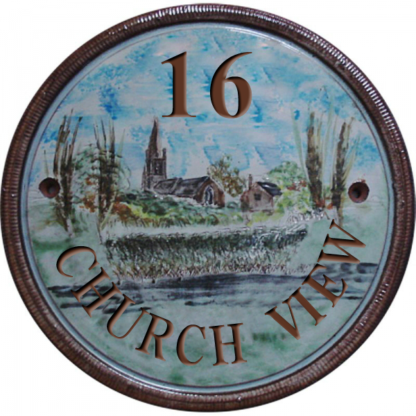 - 8 Inch Hand Painted Pottery House Plaque with a Church | House Plaque with Name