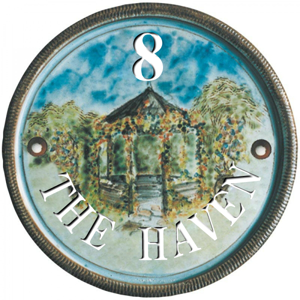 - 10 Inch Diameter Wall Plate with a Woodland Gazebo | House Sign with Name
